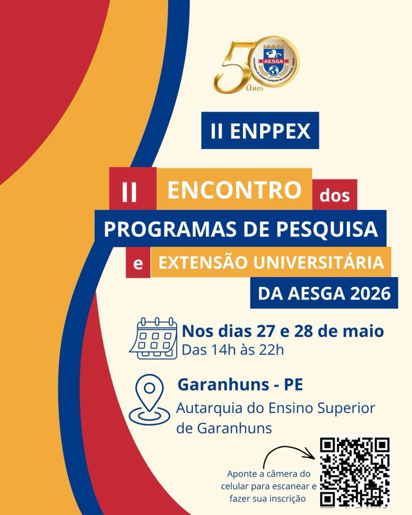 O Encontro dos Programas de Pesquisa e Extensão Universitária (ENPPEX), organizado pela Coordenação de Pesquisa e Extensão Universitária (DEPEX) da FACIGA/AESGA, será realizado nos dias 25 e 26 de maio de 2026.